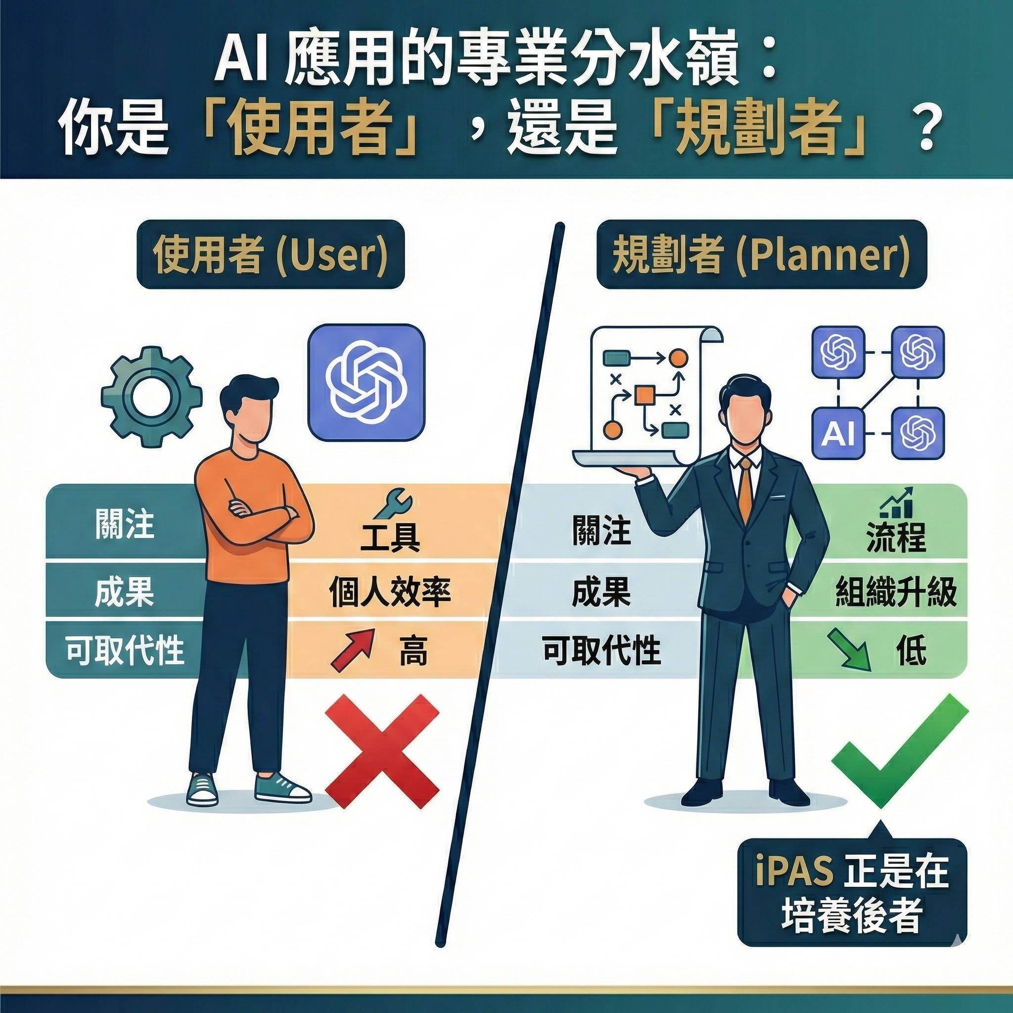 首頁 知識相關 AI 應用的專業分水嶺:你是「使用者」,還是「規劃者」? AI 應用的專業分水嶺:你是「使用者」,還是「規劃者」?wpsite.pro知識相關 類型使用者規劃者關注工具流程成果個人效率組織升級可取代性高低 iPAS 正是在培養後者。 wpsite.pro 上一 文章 AI 不會讓你失業,但「沒有專業定位的 AI 人」一定會 下一 文章 為什麼「AI 用得多」的人,反而更需要 AI 應用證照?